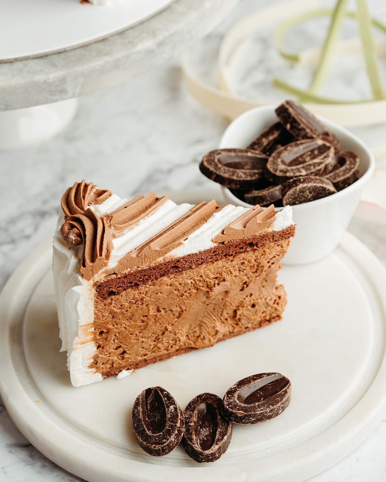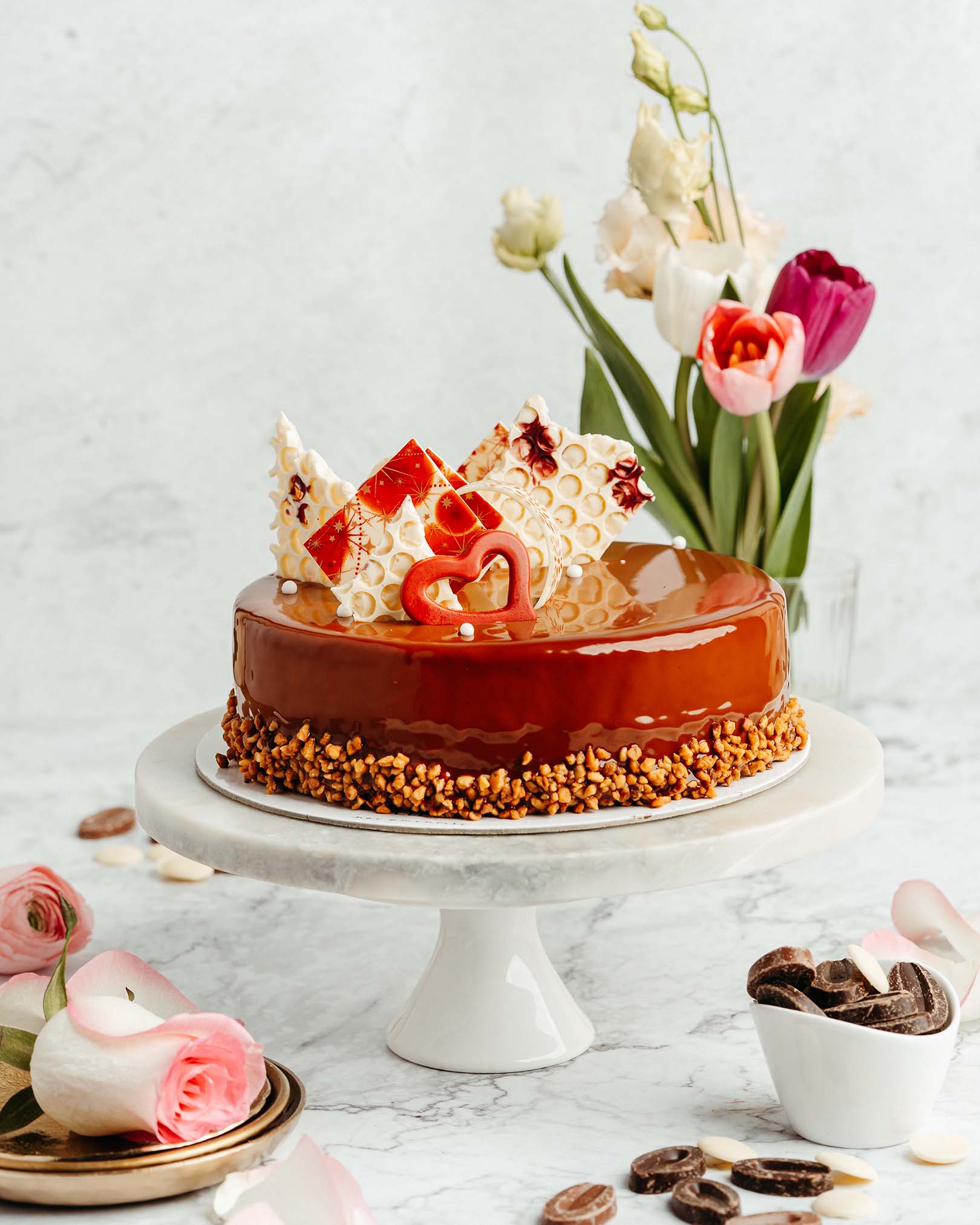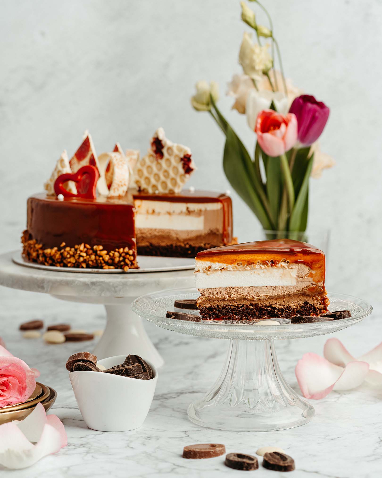 blat de ciocolată, pralin crocant de ciocolată cu lapte și alune, caramel, mousse de ciocolată cu lapte, alune caramelizate, panna cotta de vanilie, mousse de ciocolată albă