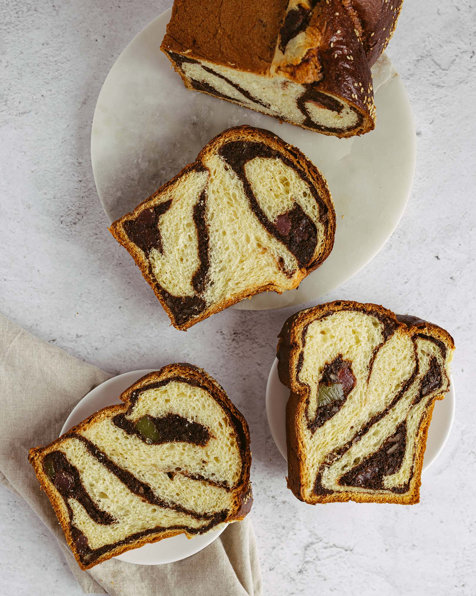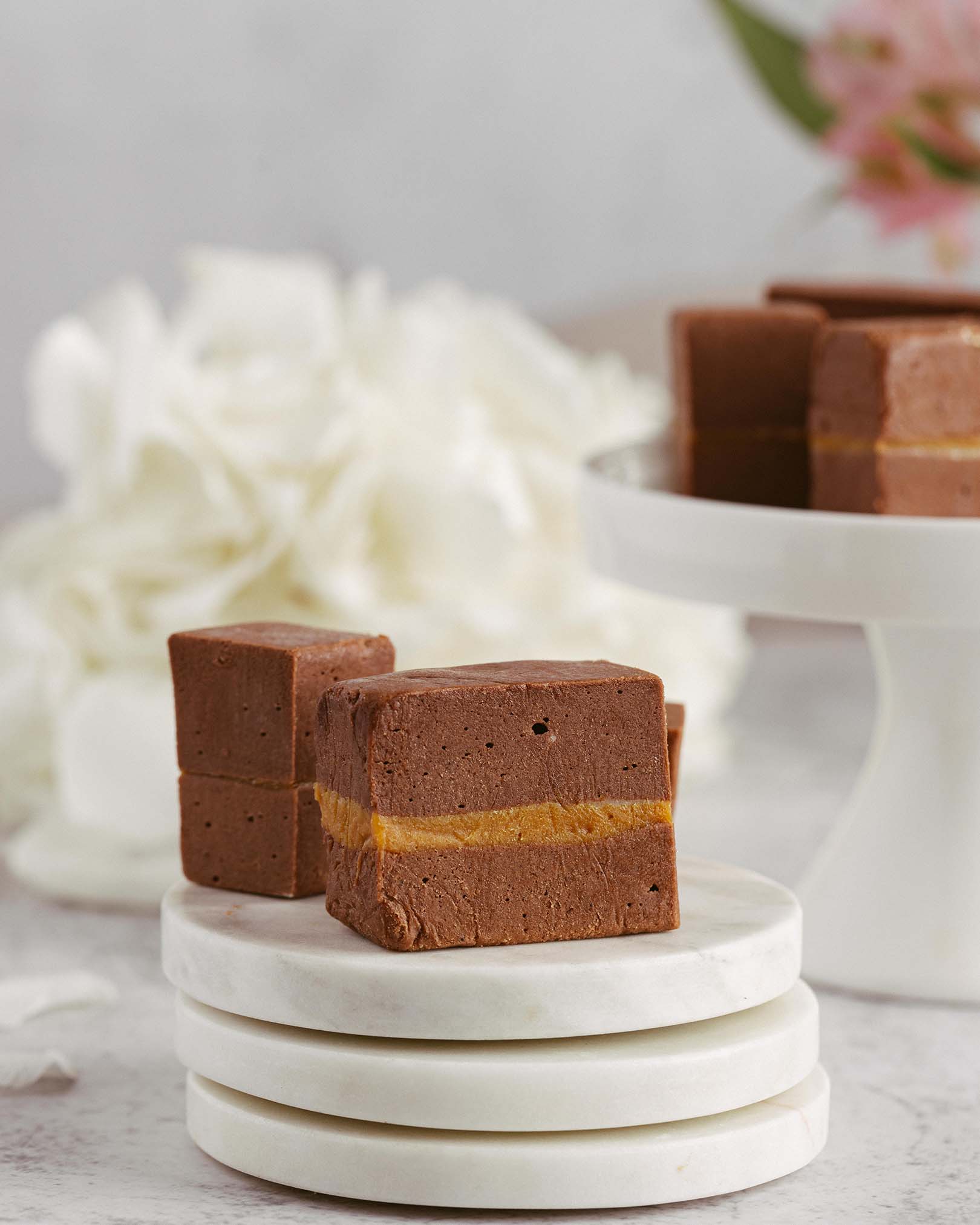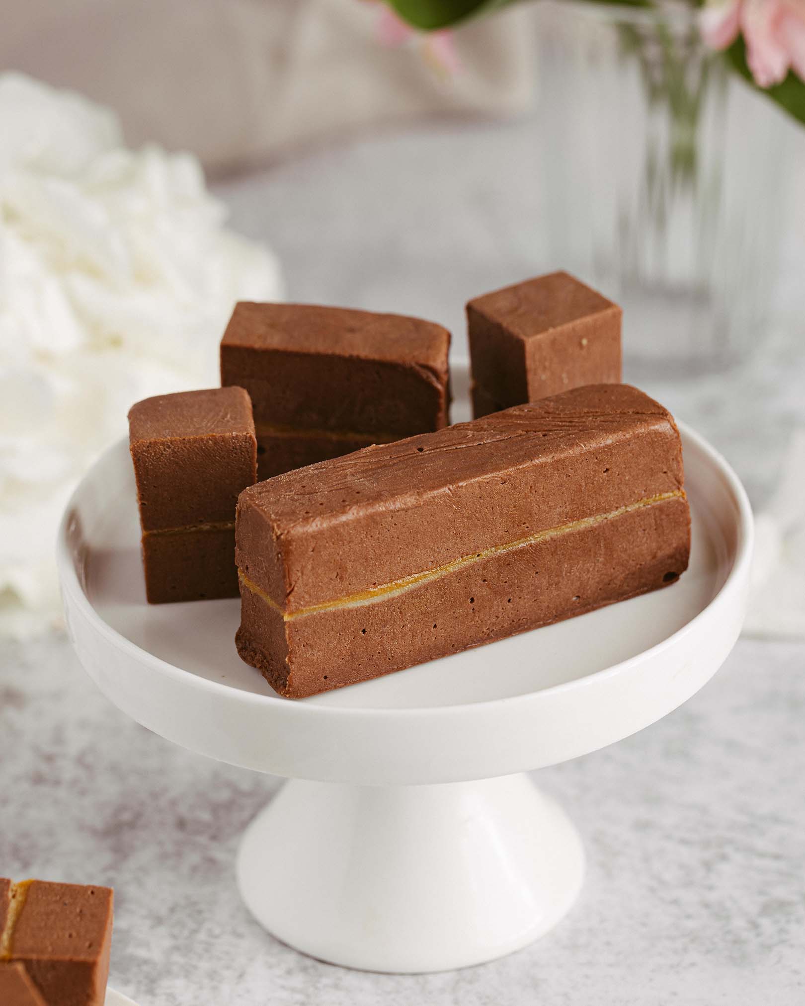 blat de ciocolată, pralin crocant de ciocolată cu lapte și alune, caramel, mousse de ciocolată cu lapte, alune caramelizate, panna cotta de vanilie, mousse de ciocolată albă