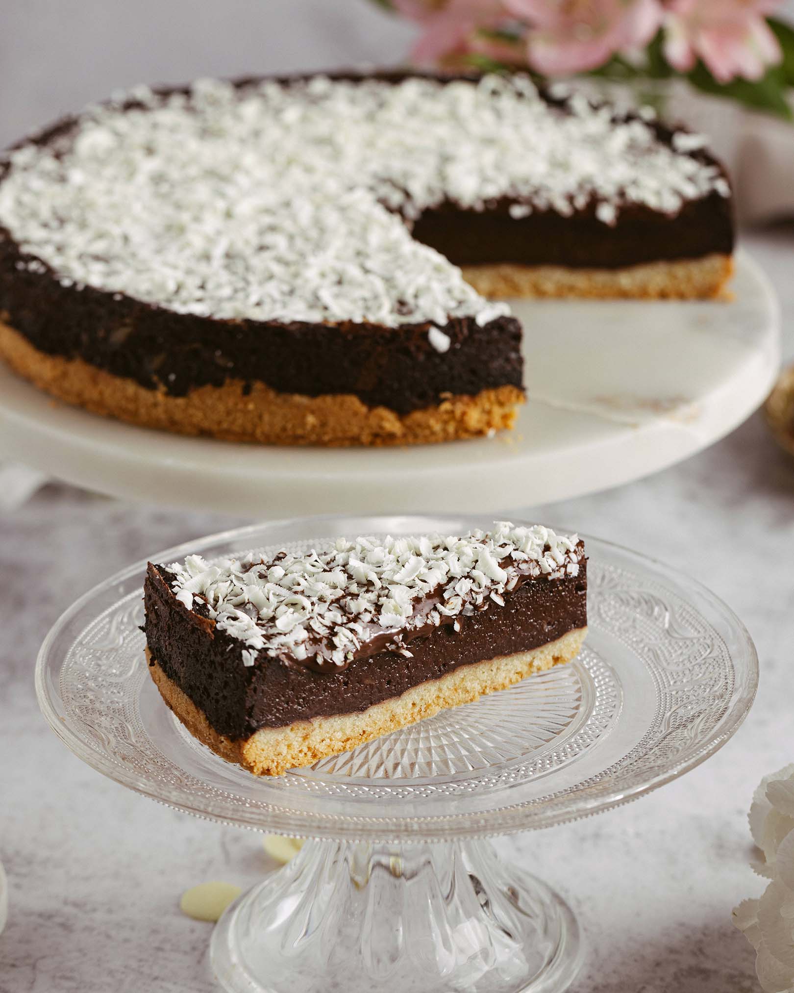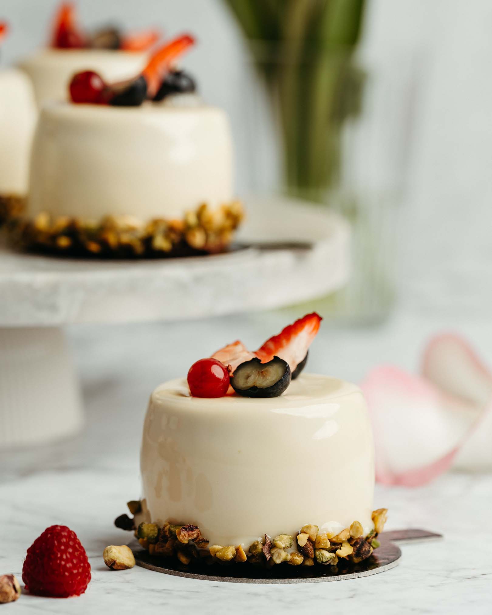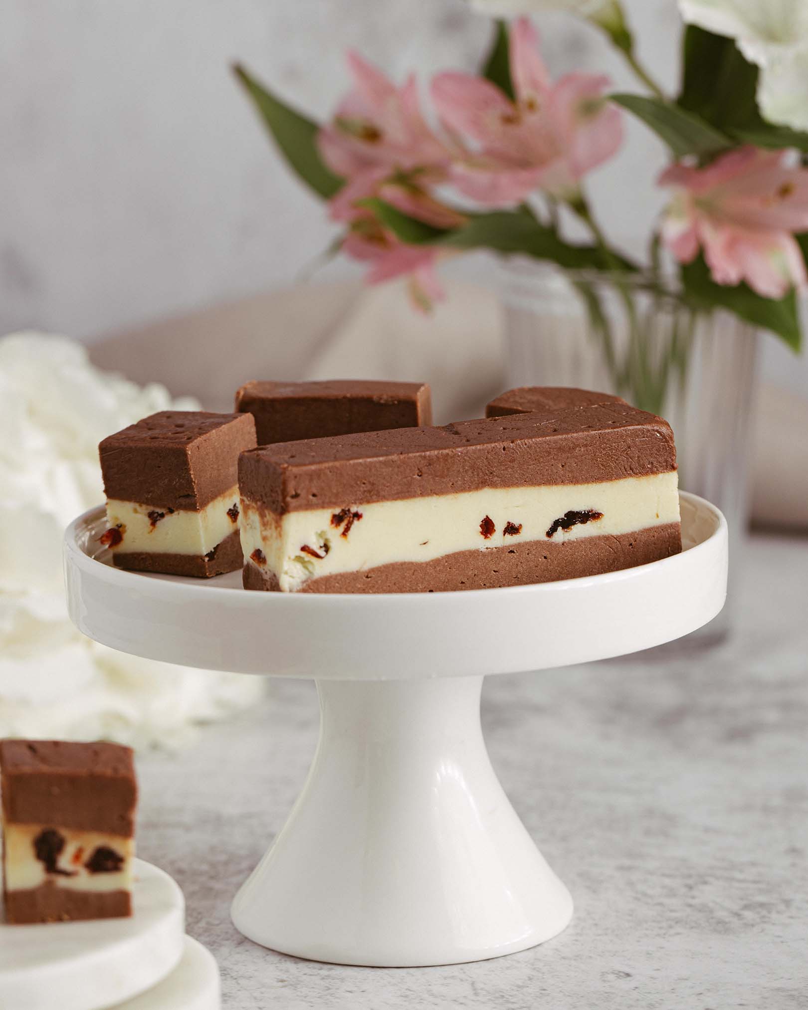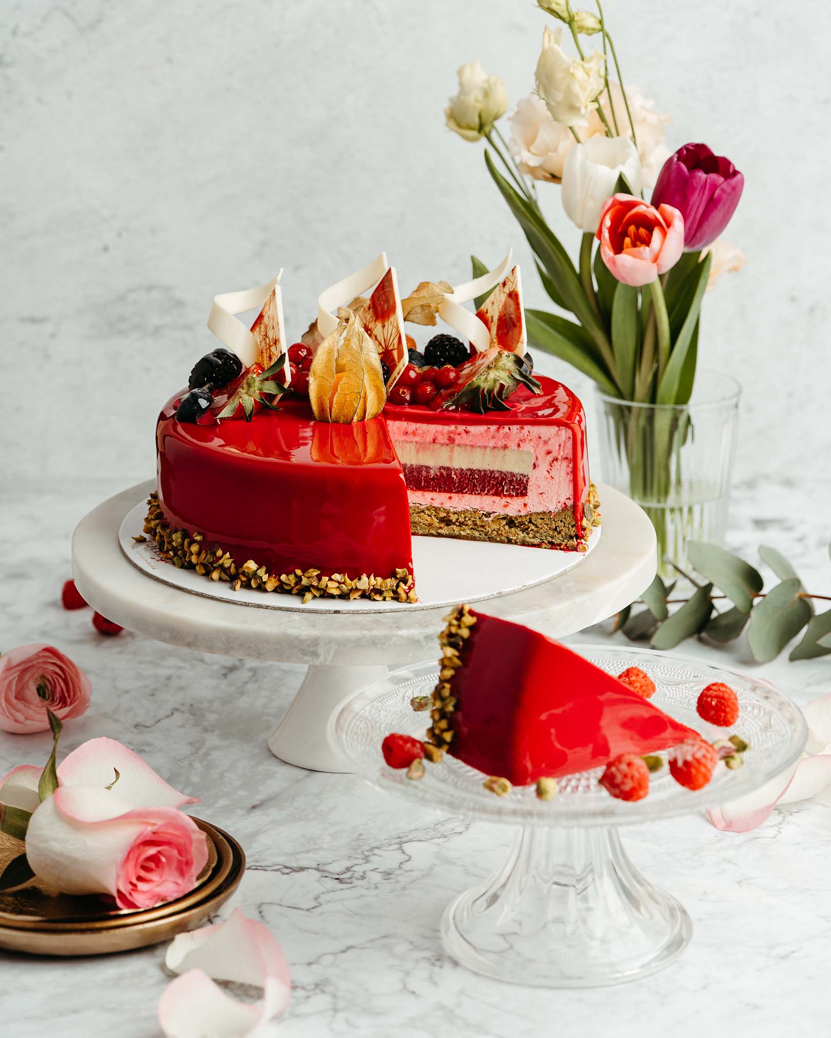 blat pandișpan alb, pralin crocant de ciocolată cu lapte și alune, mousse de ciocolată cu lapte, alune caramelizate, panna cotta vanilie, mousse de ciocolată albă