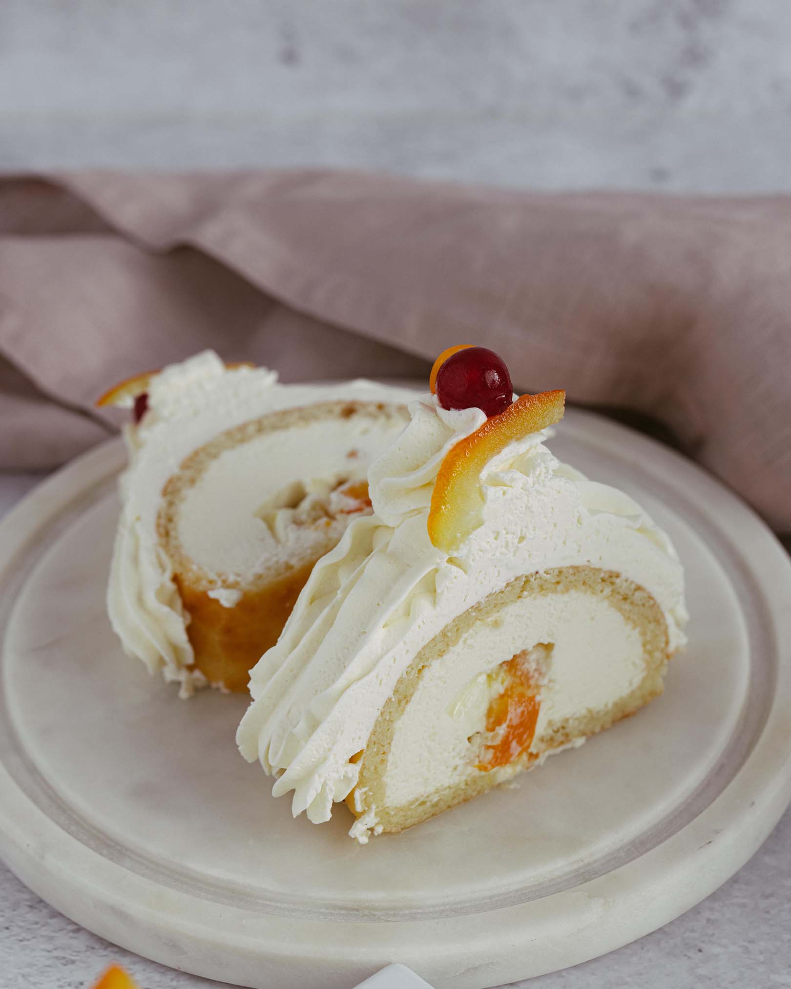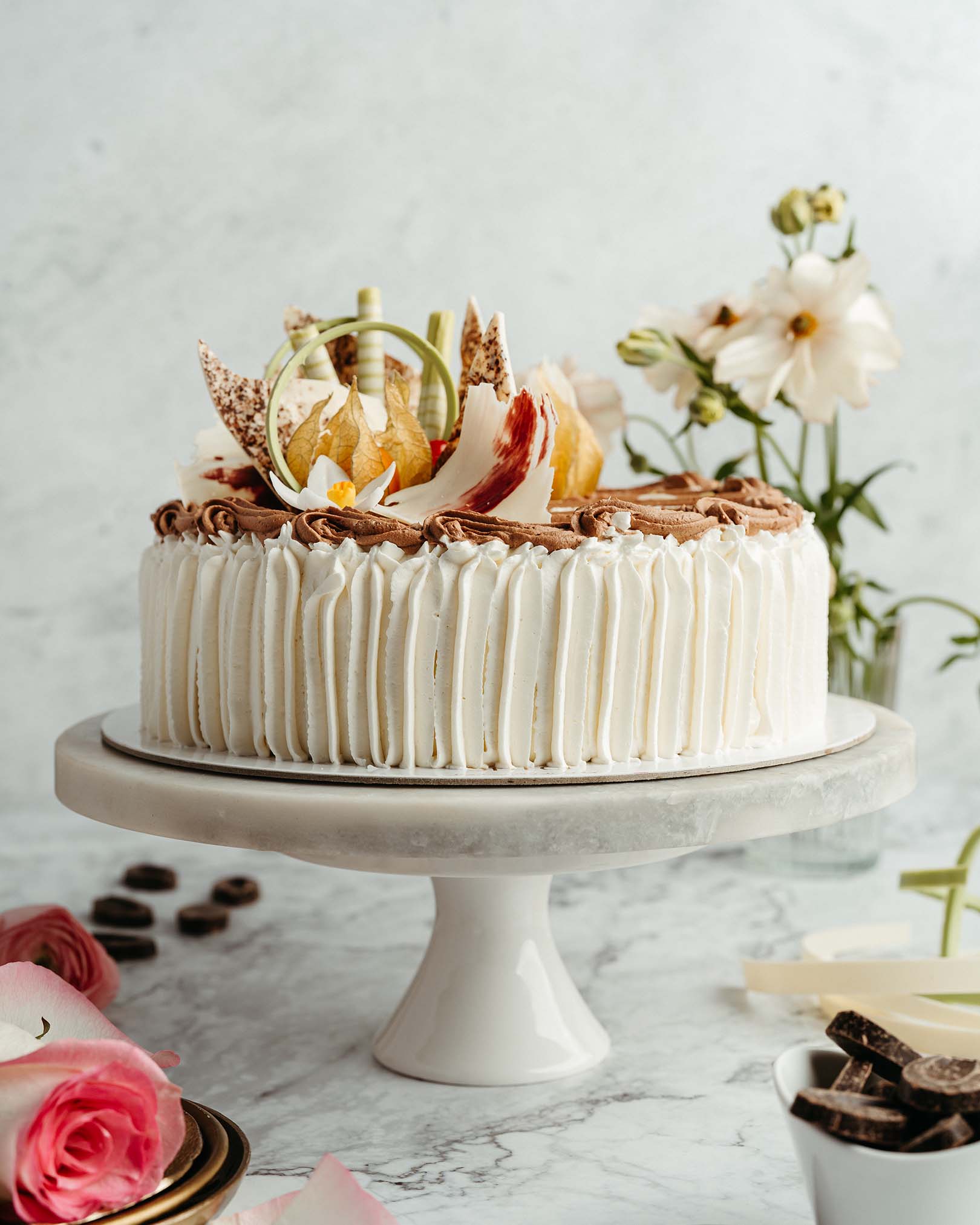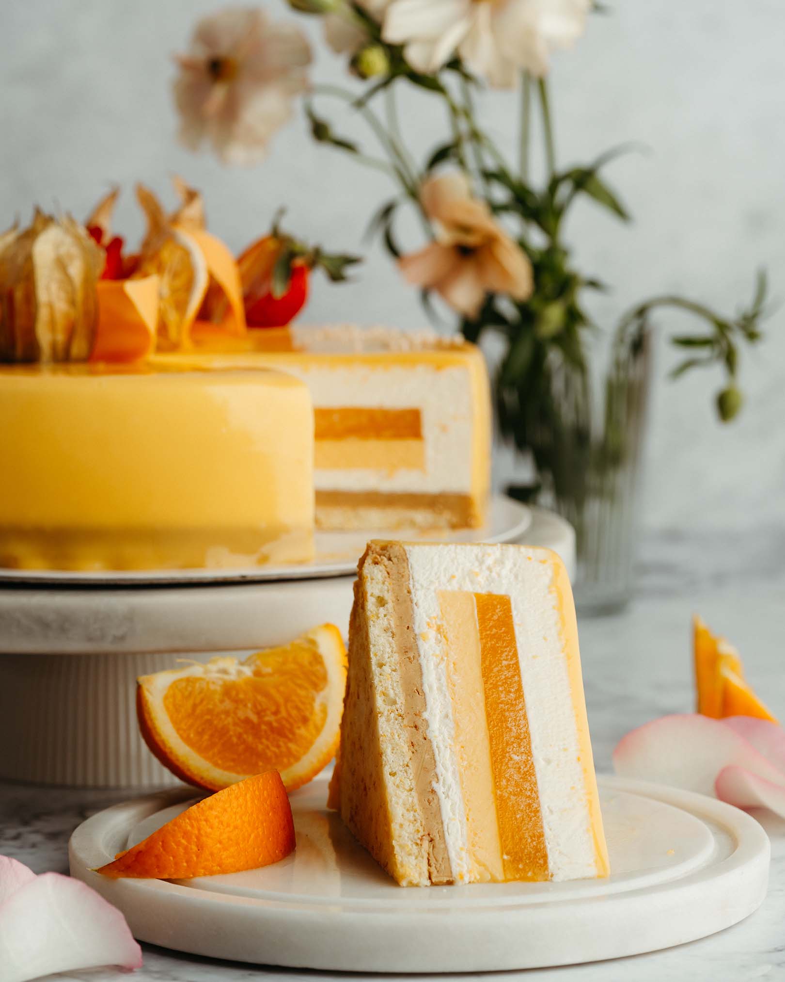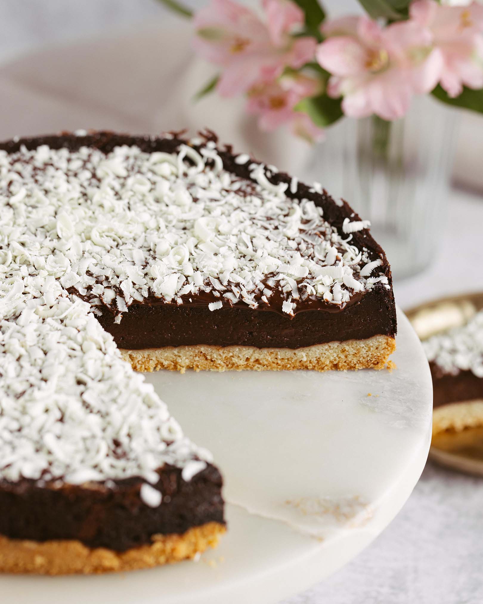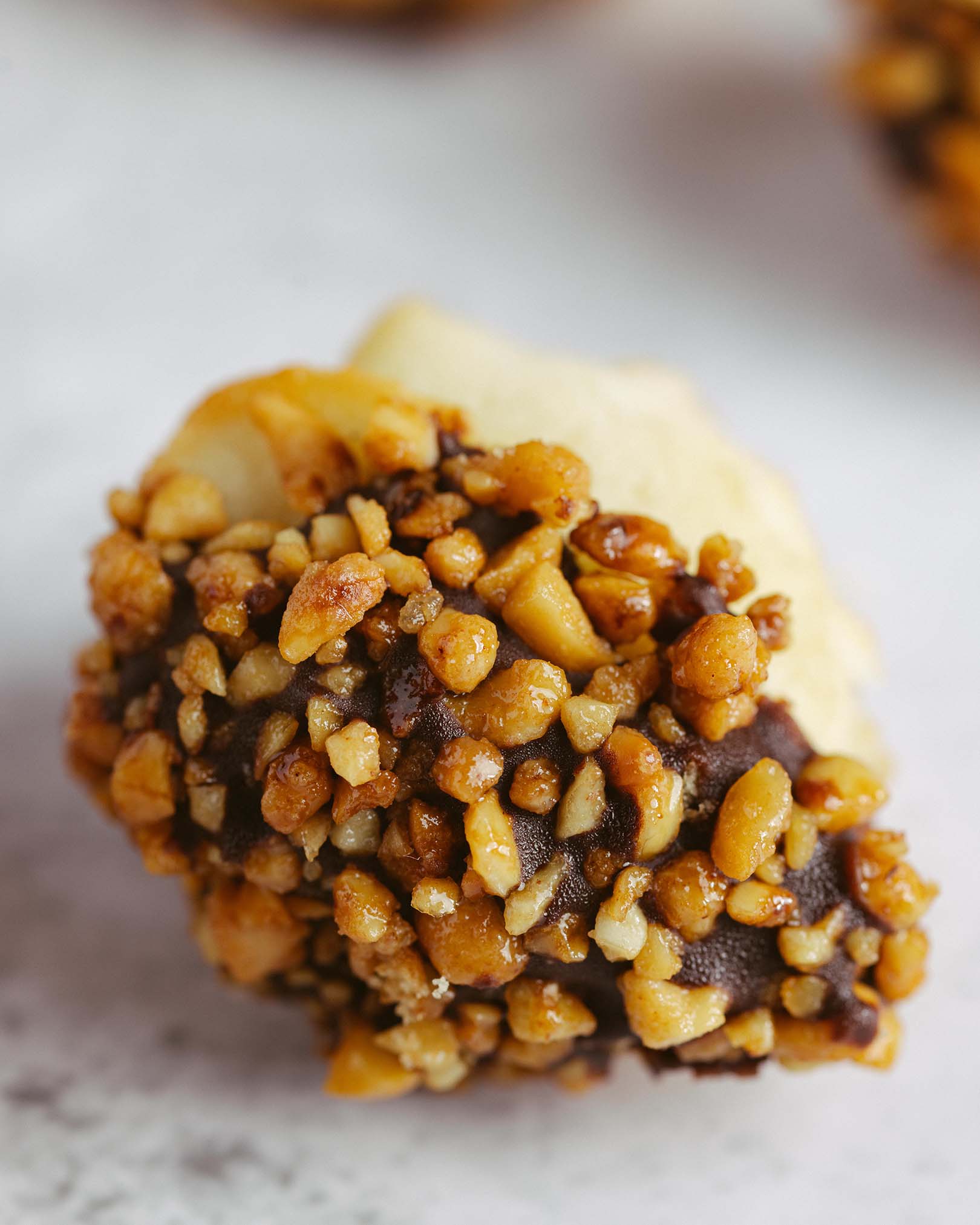 blat pandișpan alb, pralin crocant de ciocolată cu lapte și alune, mousse de ciocolată cu lapte, alune caramelizate, panna cotta vanilie, mousse de ciocolată albă