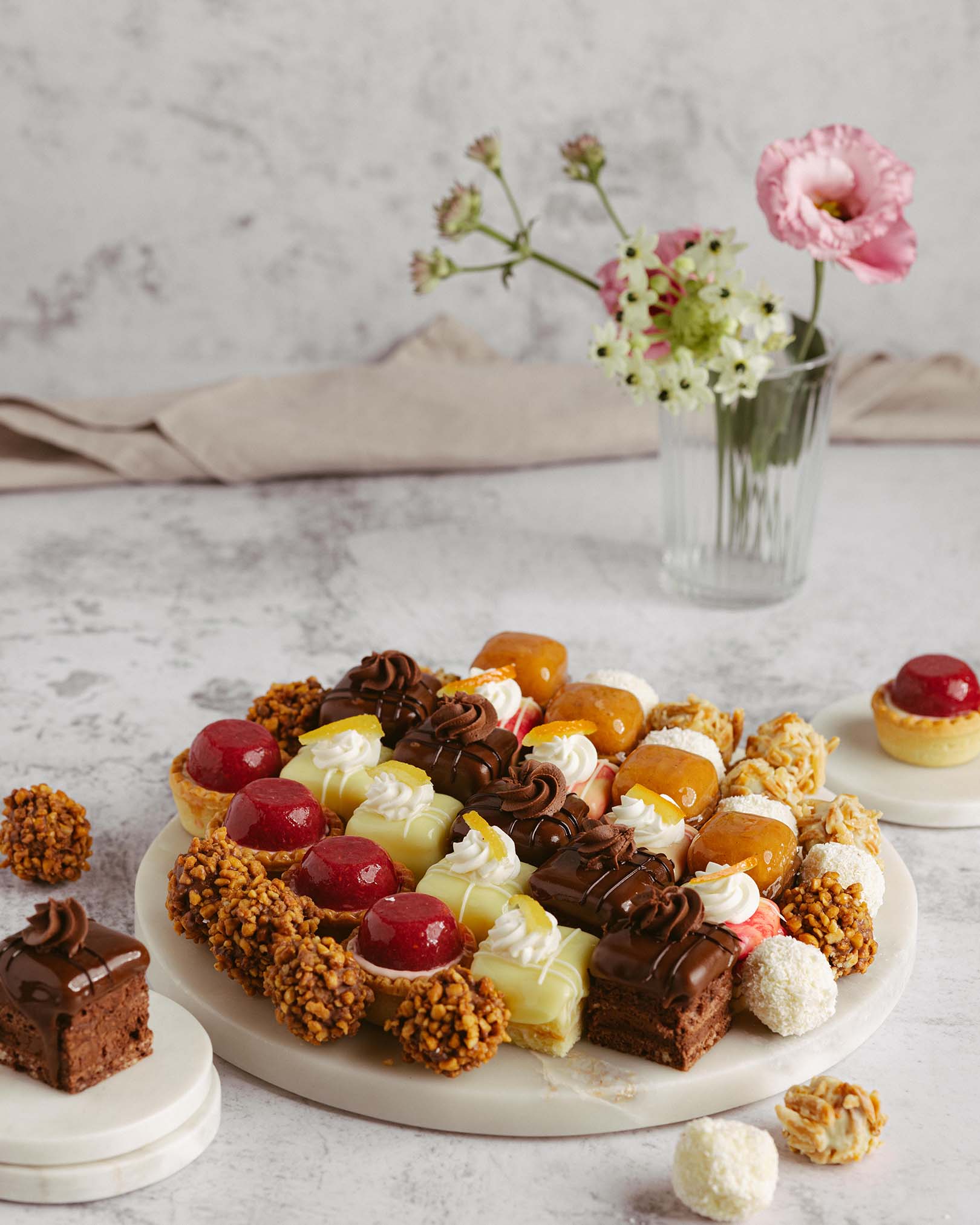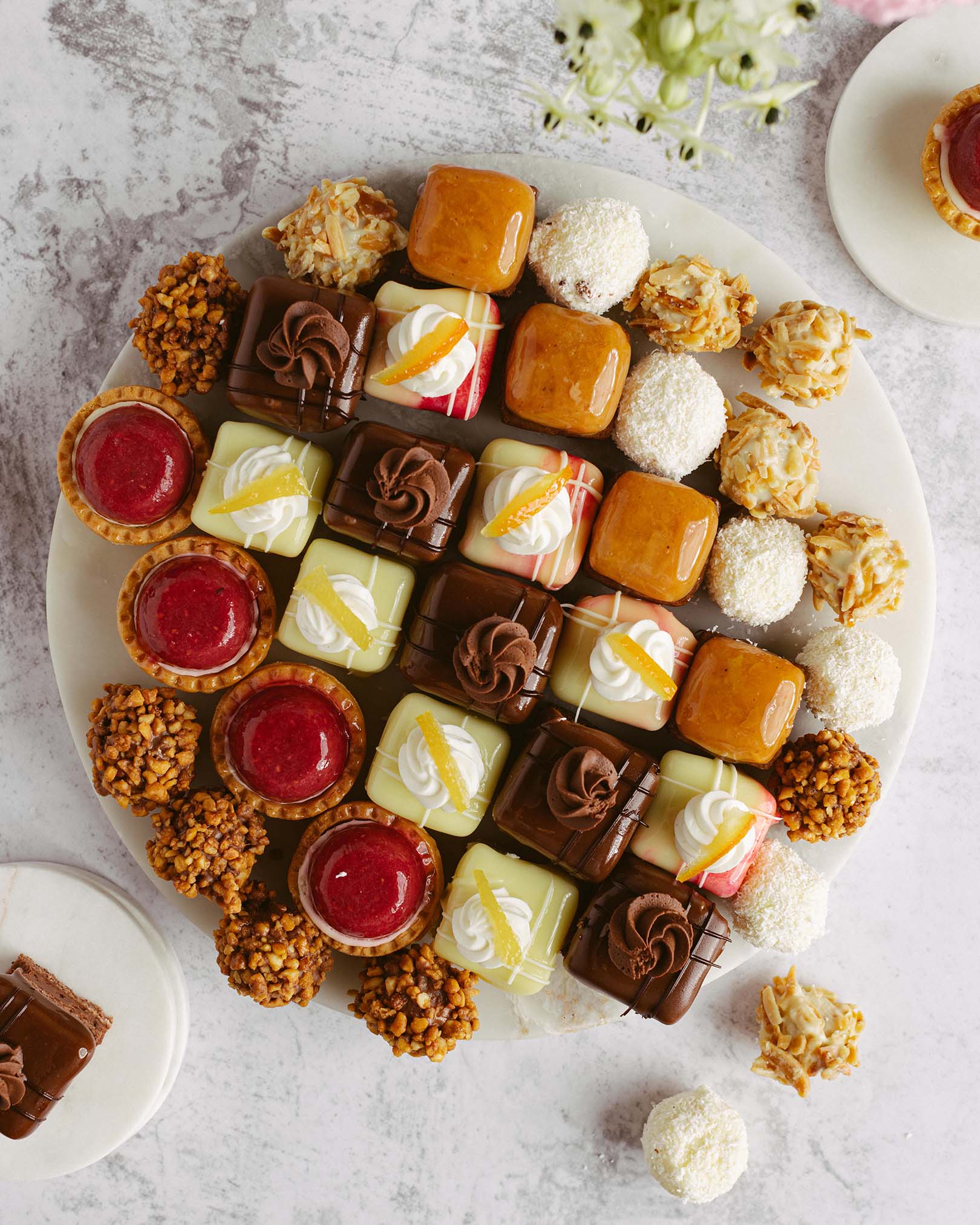mini eclere, mini amandine, mini arancia, mini lemon, fursec Alba ca Zapada, mini tarte cu gutui, mini tarte cu zmeura, bomboane caramel, bomboane Bulgari de nea